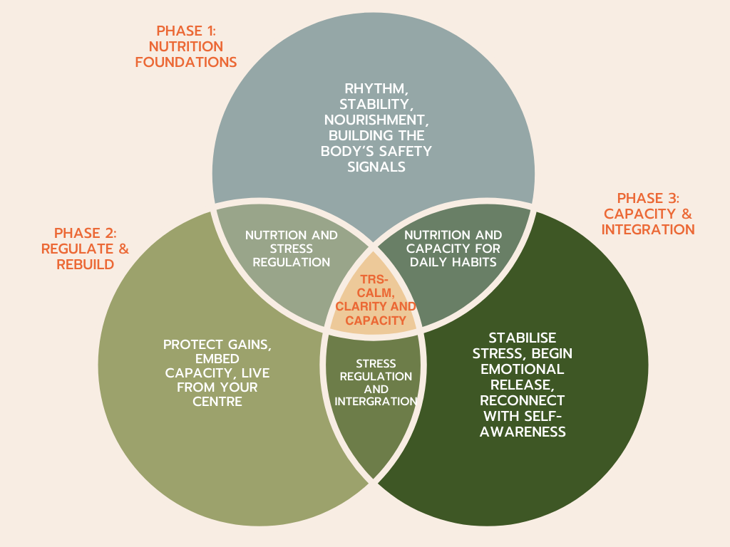 Stabilise the stress response, begin emotional release, nourish foundational metabolic and hormonal pathways, and gently reconnect with self-awareness and rhythm.